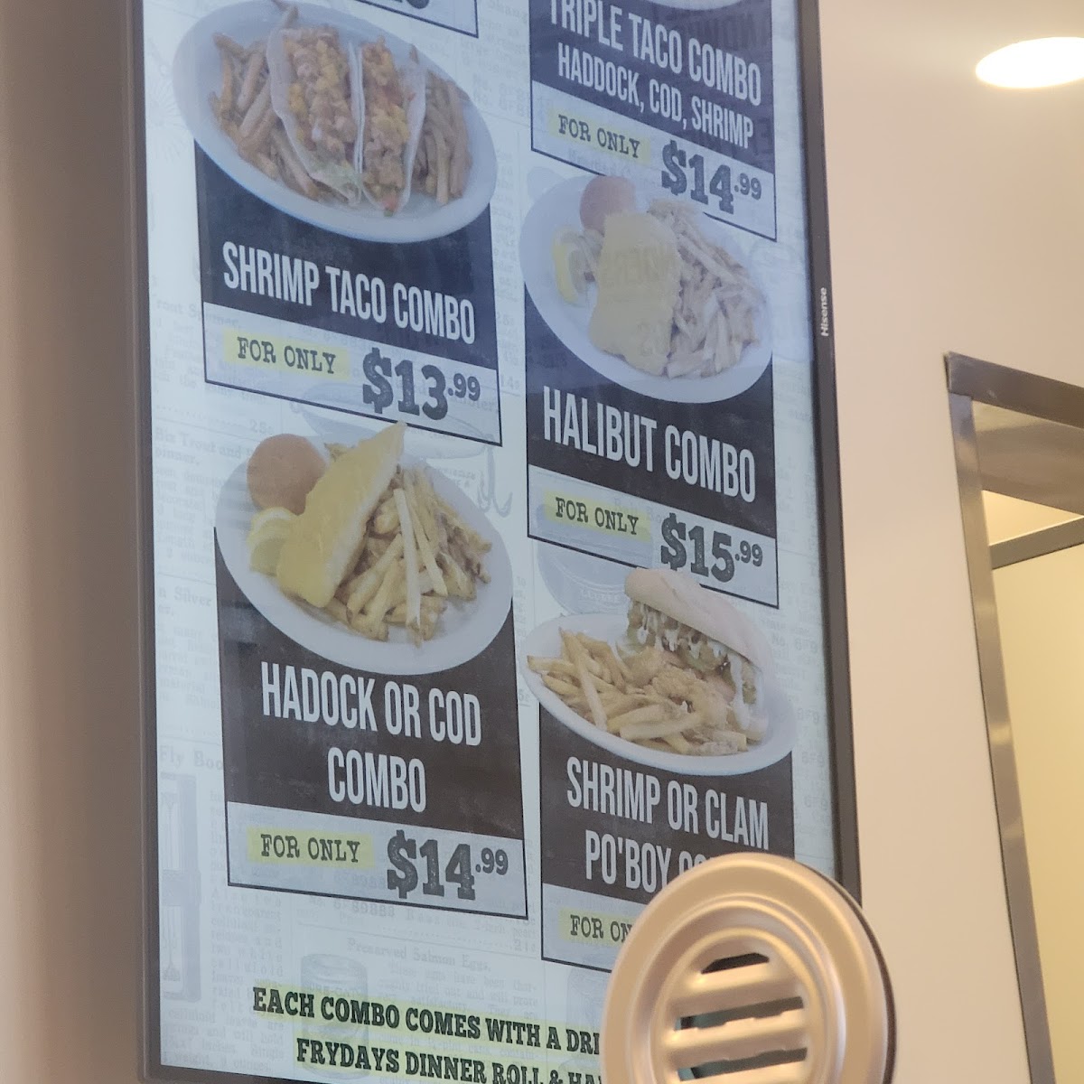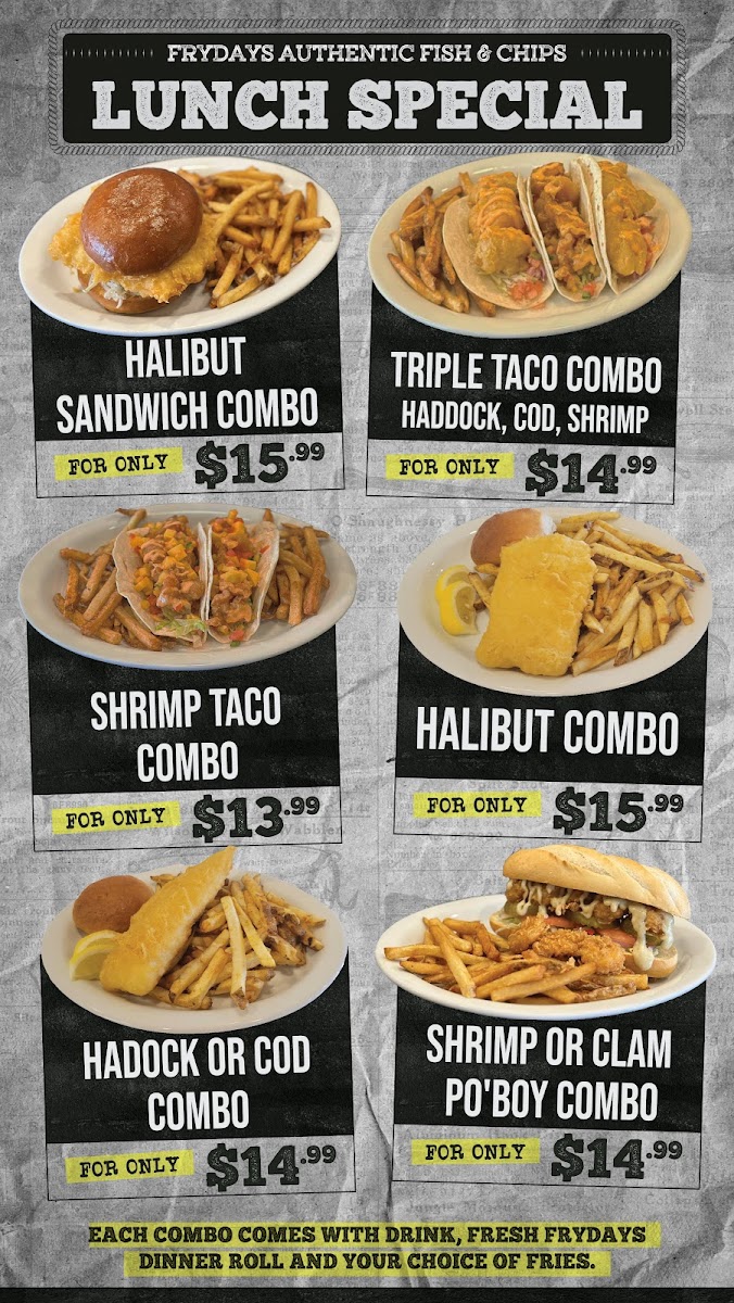 A Specialty Cut Halibut Fillet paired with our tasty Cod fillet. Deep Fried in Fryday's secret Batter. Served with Fries, Dinner Rolls, Coleslaw & Fountain Drink