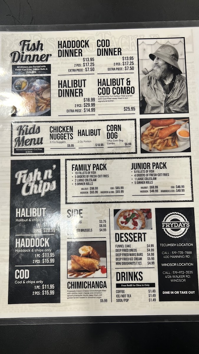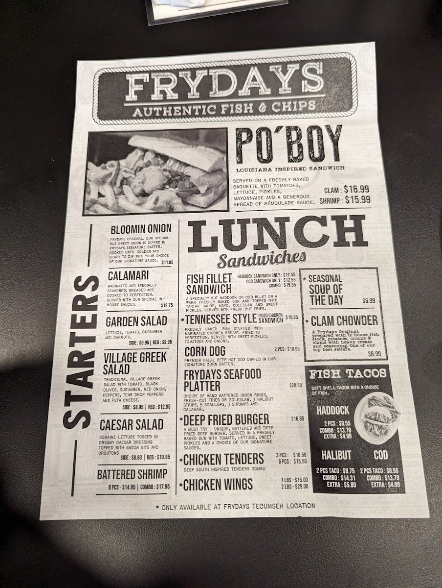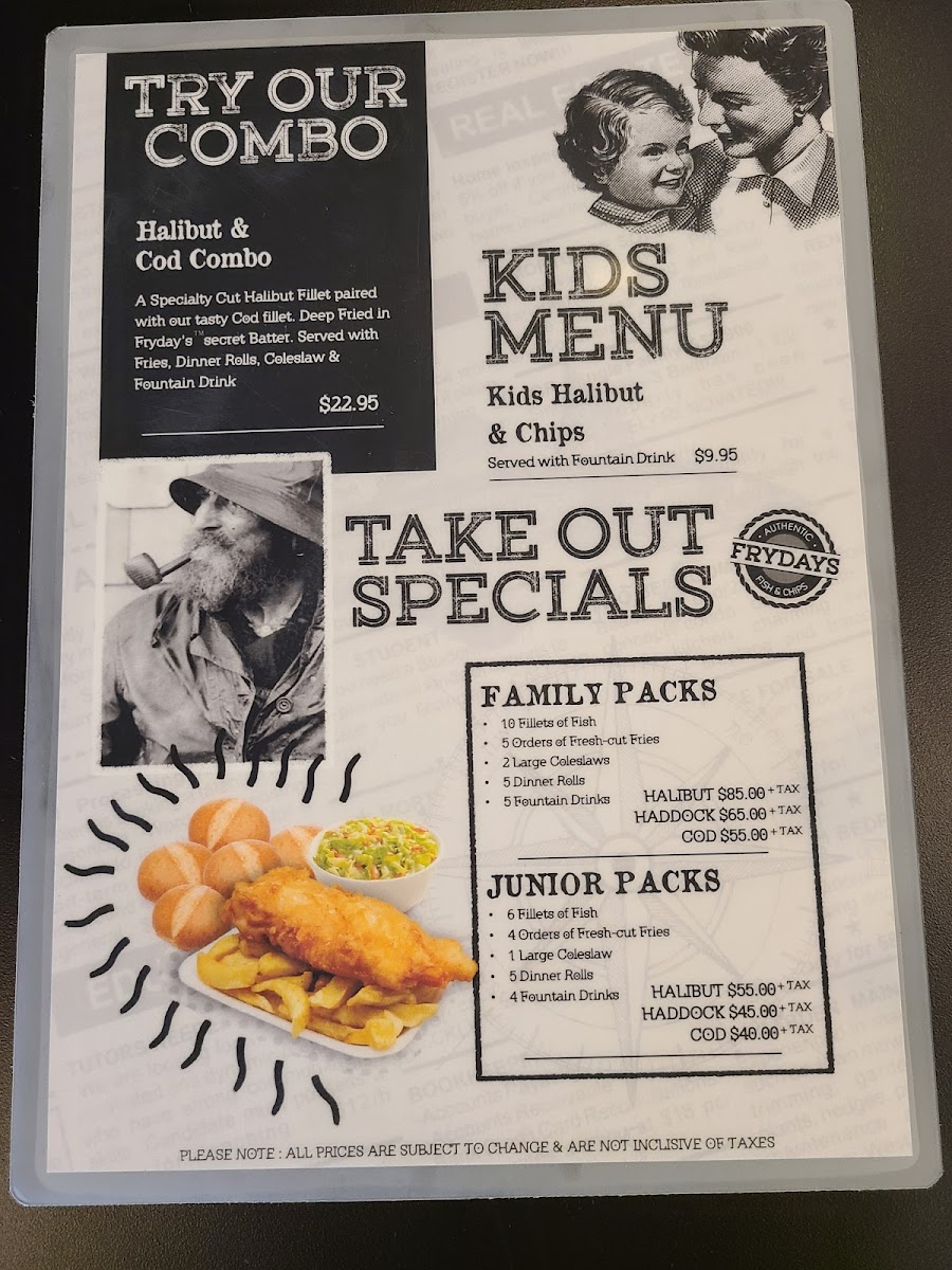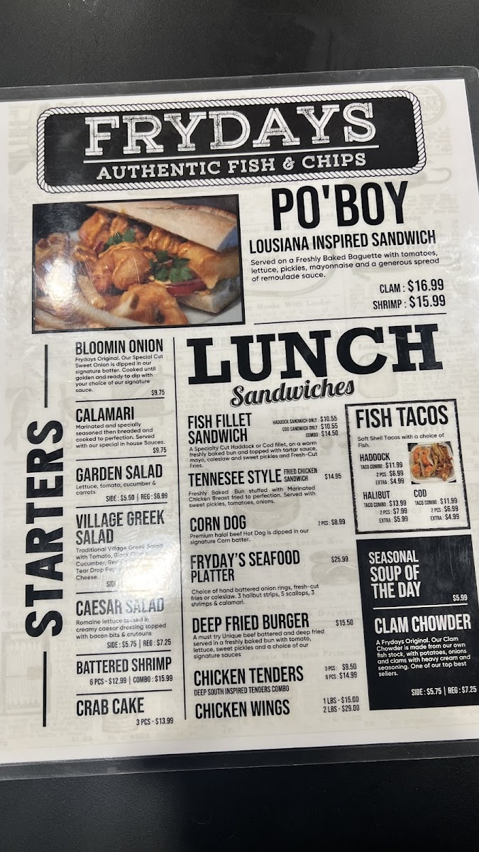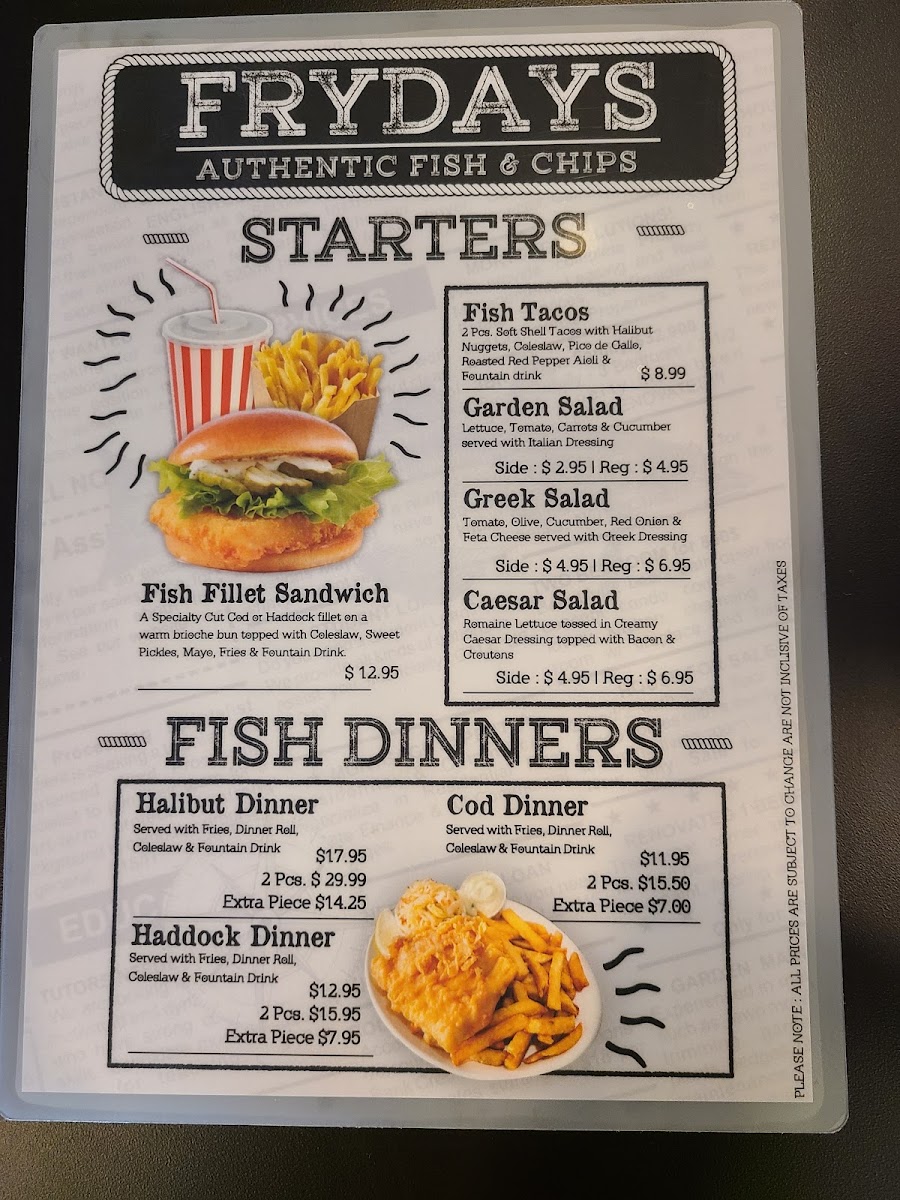 Fryday's Authentic Fish & Chips offers a variety of tasty options to suit any palate. A standout choice is their Halibut & Cod Combo, which combines the best of both worlds for an enjoyable seafood experience. For those looking for lighter fare, the Fish Tacos are a flavorful and fresh starter, perfect to kick off your meal. The restaurant also serves two sizes of Garden Salad, with the option to choose between a Side or a Regular portion, offering a healthy addition to your meal. Whether you're in the mood for a hearty combo or something lighter, Fryday's menu caters to various tastes, ensuring a satisfying dining experience.